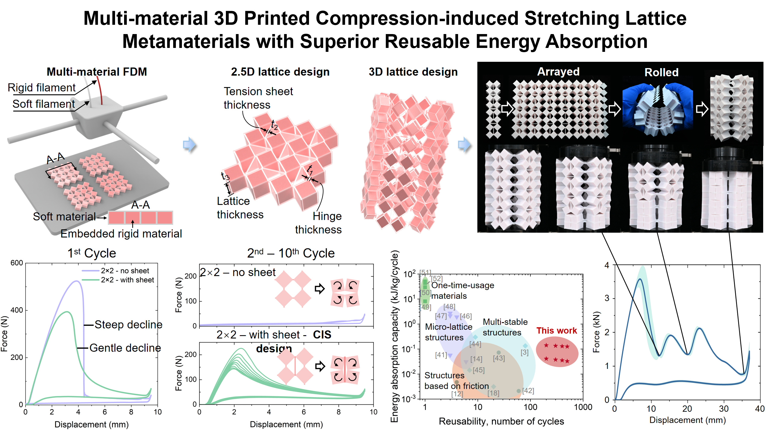 ![]() | Multi-material 3D printed compression-induced stretching lattice metamaterials with superior reusable energy absorption. Haitao Ye, Xingjian Huang, Liuchao Jin, Sicong Zhou, Guoquan Xie, Zongxin Hu, Rui Li, Haoming Mo, Shitong Fang, Wei-Hsin Liao, Qi Ge*, Xu Song*. Virtual and Physical Prototyping, 2026. |